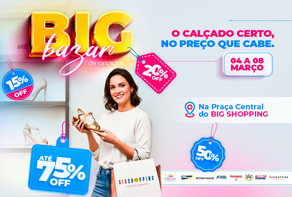 O calçado certo, no preço que cabe! 👟 Venha aproveitar agora o Big Bazar de Calçados com descontos imperdíveis de até 75% OFF.